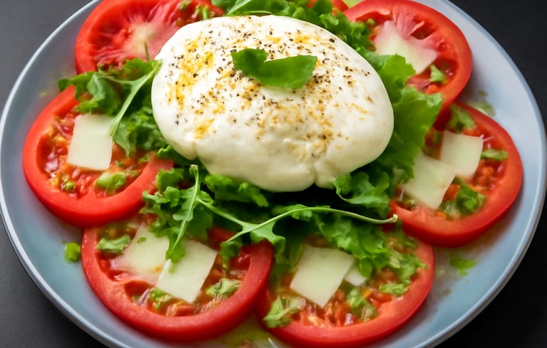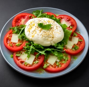 Burrata cremosa, tomate dulce, rúcula y pesto de albahaca.
